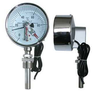 電接點雙金屬溫度計是利用溫度變化時帶動觸點變化,當其與上下限觸點接觸或斷開的同時,使電路中的繼電器動作,從而自動控制和報警。
