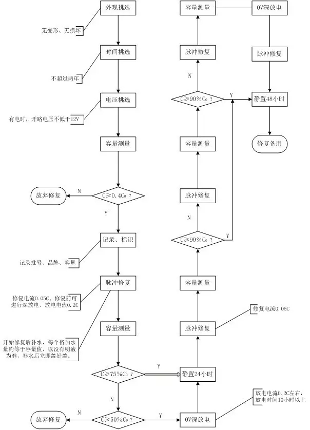 (3)容量不低于額定容量的40%,容量低于額定容量40%的電池,修復后難以達到理想容量值。